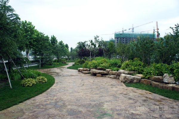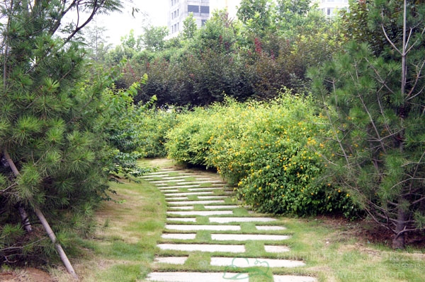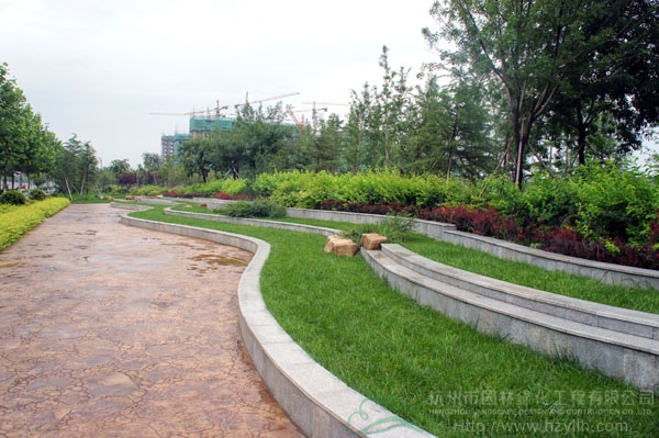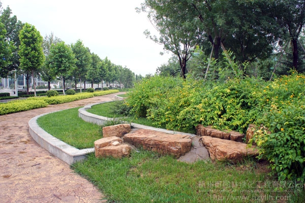 山東壽光市東環(huán)路東側(cè)綠化改造工程(圣城街-北環(huán)路)面積9萬平方米,施工范圍為機(jī)動車道與非機(jī)動車道之間2.5米的隔離綠化帶和30多米寬的路側(cè)綠化帶,施工內(nèi)容包括土方地形整理、綠化種植、園路鋪裝、景石擺放、景觀小品營建等。2009年9月開工,2010年7月竣工。經(jīng)過2年的精心養(yǎng)護(hù),如今,這里樹木蔥郁,花草繁茂,一路走來,隨著多種風(fēng)格的園路在腳下延伸,風(fēng)景也在眼前不斷變化。