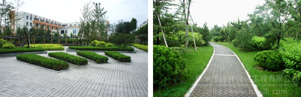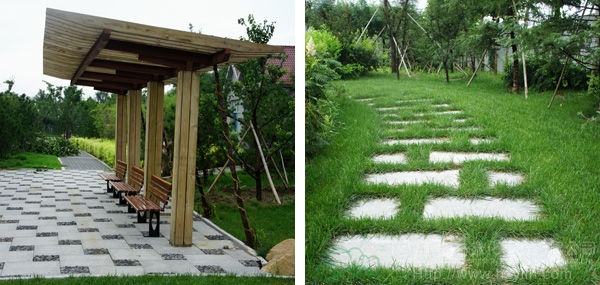 而在道路十字路口的節(jié)點處,則主要是用10cm×10cm的小花崗巖鋪地,鋪出來的路面整潔、平坦,看似簡單,實則對施工技術要求相當高。草坪中的地面鋪裝,則采用花崗巖汀步,用錯縫鋪裝法,兩塊花崗巖之間用草皮鑲嵌,就像給每塊花崗巖鑲了一道綠邊,與旁邊的草坪和諧地融為一體。貫穿整個工程的游憩步道,全部采用“人字形”的鋪裝方法,中間用透水磚、兩邊以花崗巖鑲邊,透水磚價格不高,用以鑲邊的花崗巖是利用了鋪裝中剩余的邊料,雖然用料簡單,但通過對技術的嚴格要求,鋪出的路面卻整潔而不失韻味,是一種實用、環(huán)保、節(jié)約的做法。