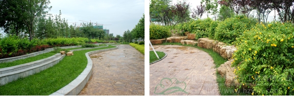 為了配合每個景觀節(jié)點的風格,園路的鋪裝材料和手法各不相同。據高經理介紹,工程中用到的鋪裝材料主要有汀布石、印花地坪、文化石、青磚、荷蘭磚、花崗巖等,其中,印花地坪是一種新型的鋪裝材料?!坝』ǖ仄褐饕迷诒睆V場上,其工藝為:在混凝土上面灑上特殊的配料,整平之后,再用模具一塊一塊壓出形狀,最后用特殊的膠水封膜,這種施工方法工藝新穎,花樣和顏色比較多,雖然工藝較為復雜,但是景觀效果非常好,遠遠看去,就如盛開在腳下的‘花?!宦峰七姸??!备呓浝碚f,“其他的鋪裝材料雖然比較常見,但我們在鋪裝工藝上進行了創(chuàng)新,如在下沉廣場的廊架旁,我們用黑色的鵝卵石與芝麻灰的花崗巖搭配,鋪出來的路面呈現(xiàn)出立體感,這種鋪裝工藝是借鑒了室內裝飾的手法,通過改造,用于室外鋪裝,遠遠看去,就像一級一級的臺階,帶動了周圍的景觀也動起來?!?/p>