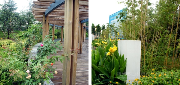 每個景觀節(jié)點上,植物的配置方法都是不一樣的,如在下沉廣場,主要是以小龍柏、金葉女貞等小灌木片植成方形或弧形,間或點綴石楠、梅樹,看起來規(guī)整、簡潔;而在設計風格為江南園林的南廣場上,是將貴重的造型油松單植,通過不同的組合,形成三個風格相近的綠島,周邊種植美人蕉、玉簪、竹子,并砌起白墻,上面開圓形拱門或圓窗,散發(fā)出詩意江南的靜謐和婉約氣息?!坝雾降朗秦灤┱麄€景觀的軸線,為了形成曲徑通幽的景觀效果,我們將對植、孤植、叢植都多種方法結合運用,特別是在三叉路口,多種植海棠、櫻花、杏花等,一方面,花開的時候,綠葉間繁花點點,會吸引人們不斷向前探尋更多的美景;而花落之后,茂密的枝葉又形成隱隱約約的視覺感受,前方轉過彎后風景什么樣,又讓人很想去看看?!备呓浝硇χf。
