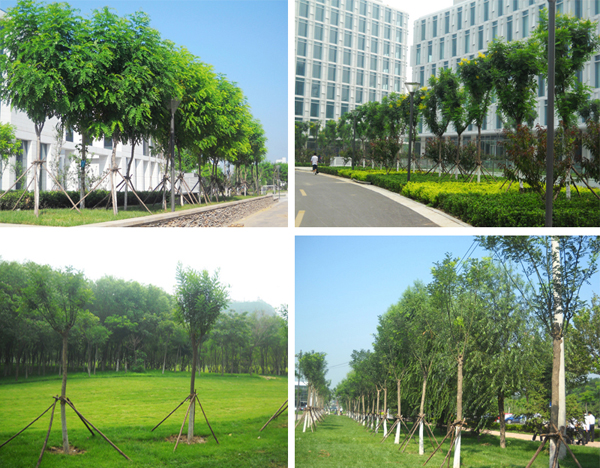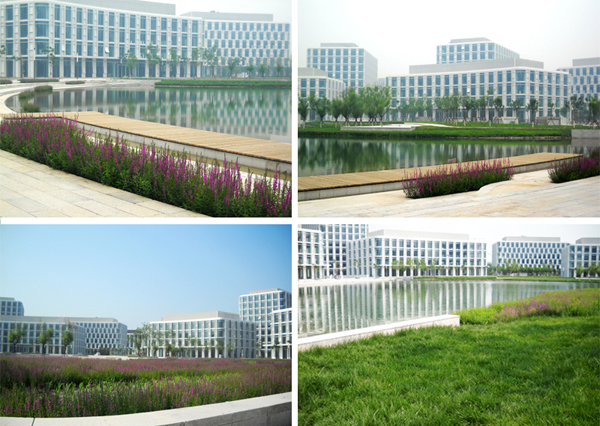 本工程是大型商務(wù)園配套景觀綠化工程,整個項(xiàng)目以人工湖為中心將建筑呈環(huán)形布置,分為內(nèi)環(huán)、中環(huán)、外環(huán)。綠化圍繞建筑均勻有層次的分布,環(huán)路兩側(cè)栽植國槐;辦公樓之間則種植日本晚櫻、碧桃、海棠等觀花、觀葉類喬木,以及黃楊、女貞等灌木和綠籬;中心湖區(qū)域兩側(cè)的能源半島和濕地半島上被喜水性植物覆蓋,起到凈化湖水的作用,岸邊種植垂柳,開辟休閑區(qū)域;園路鋪裝材料選用水洗石、花崗巖,石汀、鋪裝與綠地自然銜接;再加上花壇和景觀小品,各種觀賞性植物互相襯托,喬木與灌木合理搭配,使得景觀與建筑、環(huán)境完美結(jié)合。