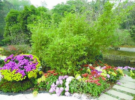 《綠廬》面積只有約400平方米,但植物配置極為豐富,在充分利用原有的桂花、櫻花、羅漢松、竹子等植物的基礎(chǔ)上,又加入了彩葉冬青、厚皮香、銀霜女貞、紅葉扶桑、龜甲冬青、紅花檵木、美人蕉、蘭花三七、沿階草、金邊胡頹子等幾十種植物與菊花相配置,形成了色彩絢麗、層次飽滿、清新雅致的庭院景觀。“這次應(yīng)用的菊花品種有二、三十種,主要有綠牡丹、春日見山、金龍騰云、白萬勝、紅切花、紅衣錦繡……顏色有紅、綠、粉、紫、黃等,通過不同的配植手法,營造出五彩斑斕、生機(jī)無限、高潔清雅的美景,讓人絲毫感覺不到秋之凋零,反而像是暢游春之繁花勝景。”該負(fù)責(zé)人笑著說。