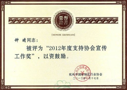 近日,杭州市園林綠化行業(yè)協(xié)會對2012年度在協(xié)會宣傳工作中表現(xiàn)優(yōu)異的通訊員進(jìn)行了表彰。其中,杭州市園林綠化工程有限公司企劃部鐘晴同志榮獲“2012年度支持協(xié)會宣傳工作獎(jiǎng)”,梁夕雯同志被授予“2012年度杭州市園林綠化行業(yè)協(xié)會優(yōu)秀通訊員”稱號。
