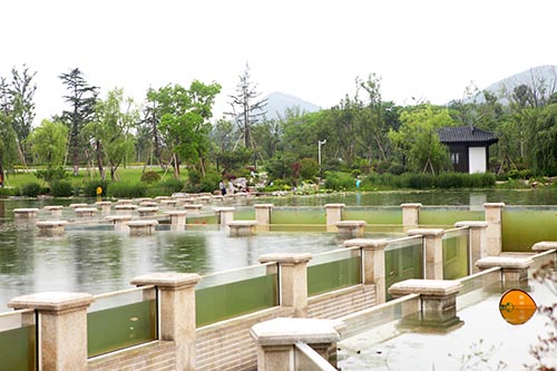 沉水廊道:總長148米,其中,北面60米,南面88米,整個廊道內(nèi)湖水域面積達(dá)1.1萬平方米,堪稱中國廊道景觀之最。廊道兩側(cè)以透明的亞克力玻璃隔斷湖水,通過先進(jìn)的水凈化系統(tǒng)對湖水進(jìn)行循環(huán)凈化處理。遠(yuǎn)觀沉水廊道,宛如蛟龍蜿蜒盤桓于湖面之中,將整個云龍湖一分為二,猶如太極中的陰陽兩儀,充分體現(xiàn)了道家文化;兩頭又與玉珠島呈二龍戲珠之勢。游人行走其中,可以欣賞各種魚類嬉戲于水生植物之間,仿佛置身于水族館之中,同時又可以觀賞到玉珠島的奇石、奇花與奇樹??芍^是匠心獨(dú)運(yùn)。