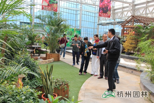 第二天,考察團(tuán)在杭州市園林綠化股份有限公司總裁張炎良、副總裁丁旭升的陪同下參觀了畫境·青山湖花園中心。該花園中心是一個(gè)集園藝產(chǎn)品研發(fā)、展示和推廣的現(xiàn)代園林高新技術(shù)平臺(tái),致力于打造庭院設(shè)計(jì)、咨詢、建造、養(yǎng)護(hù)等各類功能綜合的一站式園藝服務(wù)中心。項(xiàng)目有近3000畝配套生產(chǎn)基地,12000平米研發(fā)與生產(chǎn)溫室,以及室內(nèi)情景展示區(qū)、園藝展示區(qū),室外陳列展示區(qū)、應(yīng)用展示區(qū)等多個(gè)功能區(qū)塊。其中,用于室內(nèi)園藝展示的4000平方米的展覽溫室,引進(jìn)荷蘭PRINS溫室技術(shù),實(shí)現(xiàn)對溫度、光照等全智能控制,是一個(gè)技術(shù)含量極高的節(jié)能、環(huán)保型現(xiàn)代溫室。