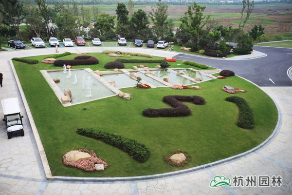 2號樓大廳門前,在大面積的草坪上,選用紅花檵木、金邊胡頹子、茶梅等一些小毛球,用中國書法的用筆法則,十分簡潔地“書寫”出點、橫、豎、鉤、提、撇、短、捺,即代表中國書法中筆畫大體的“永”字八法,傳達出“大道至簡”的書法精髓。這種匠心獨運的植物配置,將園林的造景手法與中國書法藝術完美配合,景觀效果令人耳目一新,使項目的整體景觀品位得到了質的提升,是中國傳統(tǒng)園林造景手法的典型運用。