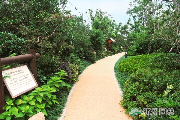 五千年的中國歷史文化,恢宏浩瀚,為園林造景提供了取之不竭的素材;園林景觀,也因為傳承了深厚的文化底蘊而散發(fā)出獨特的藝術魅力。作為一個旅游度假項目,對園林景觀的要求,不僅僅只是精致大氣、風韻天成的美景,更需要有深厚的文化底蘊,彰顯獨一無二的中國元素。為此,在2號樓大廳門前,用植物造景再現代表中國書法中筆畫大體的“永”字八法,彰顯中國書法的魅力;在泡池的建造上,運用老石碾、壓門石、老磨盤等老石材,打造出懷舊氣息濃郁的鄉(xiāng)土風情。