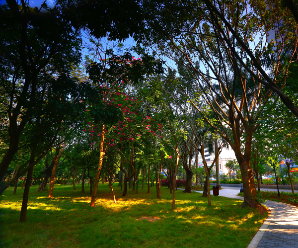 路旁綠地保留了2800多株冠幅茂密的原有喬木,根據(jù)地形又增加了不同規(guī)格的小葉榕、藍(lán)花楹、鳳凰木、宮粉紫荊、雞蛋花等喬木,小葉紫薇、丹桂、四季桂、大紅花等灌木,以及勒杜鵑、三色堇、紅車、巴西鳶尾、花葉良姜、巴西野牡丹等地被和草花植物,形成豐富的植物群落。臨近道路的邊緣則片植紅花夾竹桃、紅花羊蹄甲等做背景,下層列植尖葉木犀欖等常綠灌木,形成繁花似錦的熱鬧景觀。
