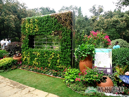 走進畫境園,只見主入口左側(cè)種植著兩株一高一矮的厚皮香樹,郭昌如笑著說,“這兩棵厚皮香寓意的是兩個萬分自豪的森林衛(wèi)士——熊大和熊二,你看,熊二還滿臉熱情地向游人不停地招手示意呢?!敝魅肟谟覀?cè)是一面立體綠植墻,所用的植物主要為黃金絡石、金寶石冬青、小葉梔子花、金邊黃楊等?!傲Ⅲw綠植墻是立體綠化的主要形式,畫境?青山湖花園中心推出的這款立體綠植墻產(chǎn)品,可以根據(jù)客戶需要,結(jié)合氣候、溫度、濕度、色彩等綜合條件,選配四季長綠或色彩豐富的植物,隨時在人們想要的地方構(gòu)建出一個貼近自然又超脫自然的生活環(huán)境,可謂是簡單又方便。”郭昌如介紹道。立體綠墻的兩側(cè),隨意地散落著一些紅陶罐,與金寶石冬青、龜甲冬青等精品球形植物,三角梅、月季、常春花、雞冠花等花卉,紫葉狼尾草、晨光芒、矮蒲葦?shù)扔^賞草混搭,營造出一種溫暖、和煦的庭院景觀。“如果把綠植墻看成是城市的建筑,此景則喻意美麗杭城的繁華一角?!惫缪a充說。綠植墻的中間還別出心裁地設置了一扇窗戶,透過它,園內(nèi)的美景已隱約可見。