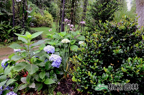 花園入口景觀:藍(lán)色的‘無(wú)盡夏’在翠竹及礬根的襯托下成功吸睛。