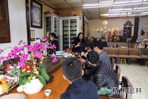 山水園林景觀公司的楊枚良女士有多年的櫻花引種、繁育、栽培、應用經驗,在臺灣業(yè)內素有“櫻花女王”之稱??疾炱陂g,考察人員特地前往山水園景觀公司拜訪楊枚良女士,交流櫻花引種、生產、栽培經驗,并前往山水園林景觀公司的櫻花苗圃基地參觀,實地考察臺灣地區(qū)主要栽培櫻花品種的生產、栽培情況。