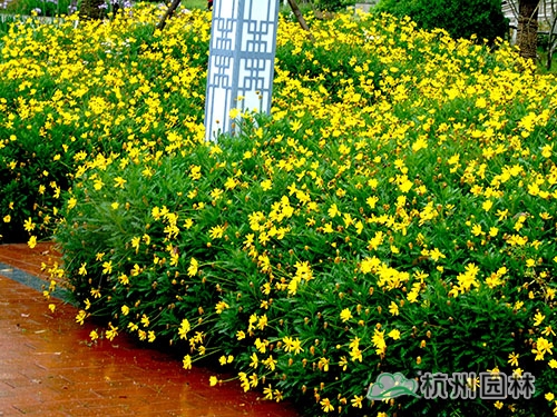 黃金菊花色金黃,在花境中色彩突出。其高度可達1.5m,可做花境背景材料、花境前景焦點材料,也可大片單獨種植。