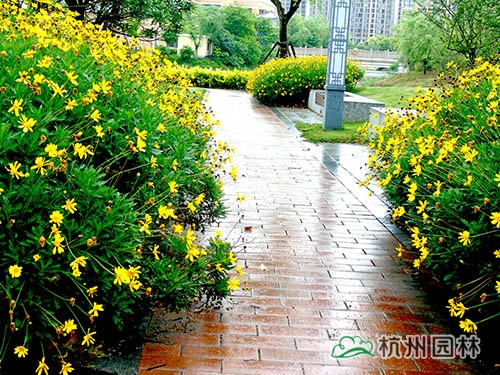 黃金菊長到一定高度易彎曲呈拱形,在路緣花境中可借助其這一特性使其枝葉、花朵垂落在地面上,形成夾道歡迎的熱鬧趣味。
