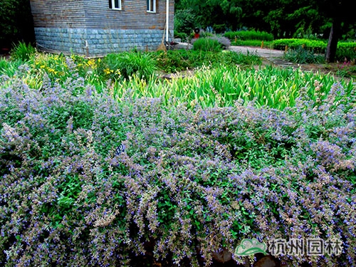 荊芥叢生狀明顯,莖葉常呈匍匐狀,花量大,色澤較淡,常出現(xiàn)在較古樸的花境景觀中,可用于軟化建筑、巖石、松柏等生硬的線條。