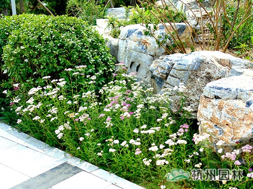 蓍草的傘形花序,配上柔軟的豎向枝條,易在風中搖曳,野趣橫生。其在堅硬的置石、石質小品旁,均能各自成趣。