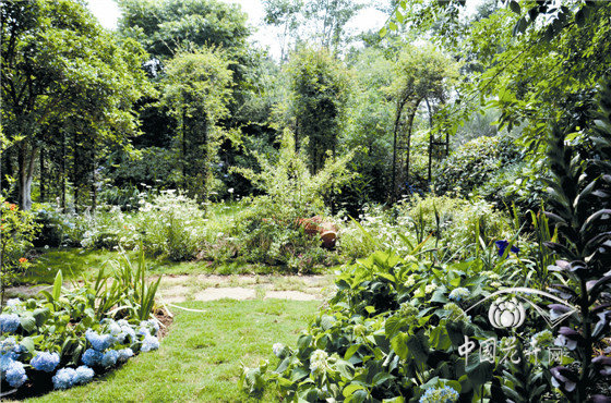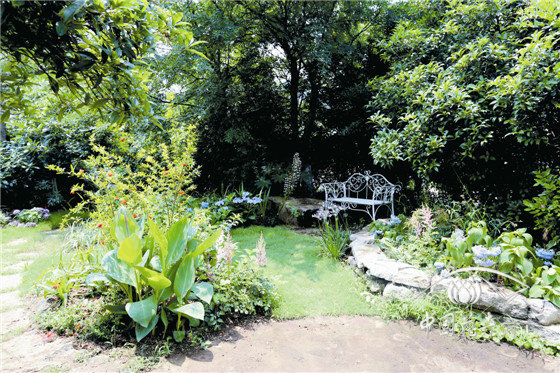 內(nèi)部八仙花花園,以櫸樹(shù)、景石、石籠擋墻及園路圍合成半開(kāi)敞空間,以八仙花為主材,搭配鳶尾、石榴、落新婦、百子蓮等,組成3個(gè)花境組團(tuán),與白色座椅形成半私密的花園景觀。