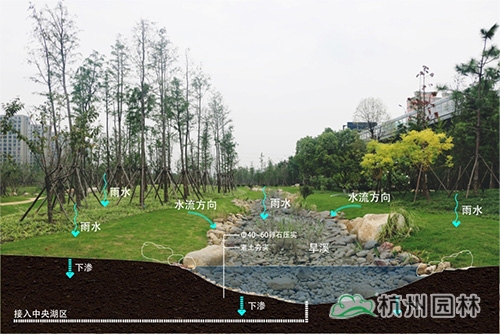 旱溪布置于帶狀綠地低洼處。設(shè)計(jì)時(shí)仿造自然界中干涸的河床,配合濕生植物的營造,在意境上表達(dá)出溪水的景觀。降雨時(shí)可減緩地表徑流,起到緩排作用。旱溪底部接盲管,將水導(dǎo)入中央湖區(qū),進(jìn)行儲(chǔ)存。