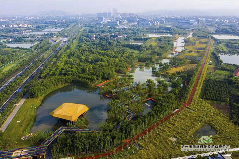 綠道建設(shè)充分融入海綿城市理念,從鋪裝材料的選擇到施工過程,均充分體現(xiàn)生態(tài)環(huán)保,與整個(gè)公園景觀和諧相融,集生態(tài)環(huán)保、觀賞游玩、休閑運(yùn)動(dòng)為一體。沿綠道而行,蜿蜒交錯(cuò)約2公里的空中廊橋,讓人體驗(yàn)林中穿梭、空中漫步;‘鉆石切割、珍珠光澤’的珍珠涼亭,夜晚,在燈光的折射下,會(huì)散發(fā)出迷人的光澤,猶如一串閃耀奪目的珍珠,璀璨奪目。從高空俯瞰,紅色的綠道在碧水綠樹中穿行,將沿途景觀有機(jī)串連,形成一幅風(fēng)格鮮明的生態(tài)風(fēng)景畫卷。