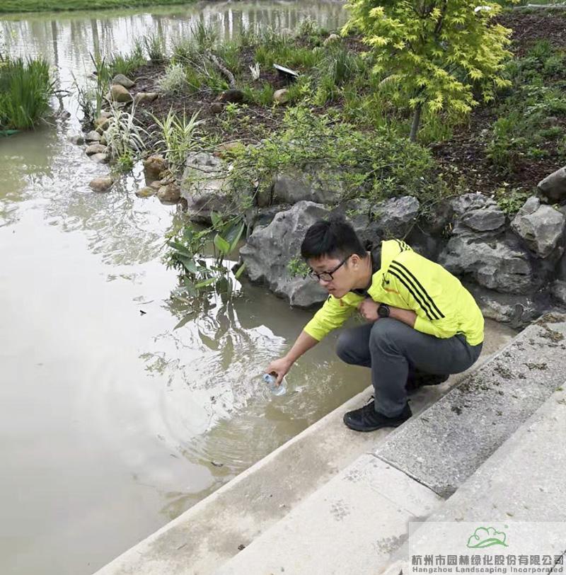 研發(fā)中心副主任高凱在浙江園取水樣測PH