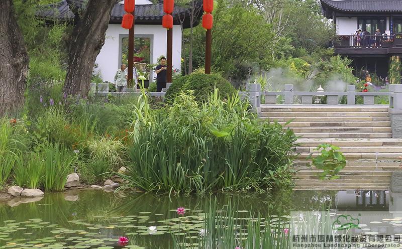 位于展園北側湖面上的新型生態(tài)浮島,采用框架結構與木本植物相結合的漂浮花壇技術,在浮力大的新型高分子材料浮槽上鋪設種植基質,配置厚皮香、芒草、千屈菜、再力花、梭魚草、旱傘草、美人蕉等植物,形成優(yōu)美的水上景觀。并結合岸邊和水中的旱柳、千屈菜、黃花鳶尾、水蔥、香蒲、菖蒲、蘆葦、荷花等水濕生植物,營造出豐富多變的湖面景觀,同時起到凈化水體的生態(tài)環(huán)保效果。