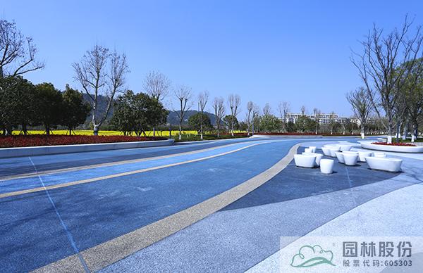 從各個廣場到沿溪綠道,全部采用透水混凝土材料,并在兼顧排水功能的同時,通過色彩、圖案的變化,營造移步換景的濱水景觀。廣場鋪裝主要選用深灰、淺灰、土黃等色彩的透水混凝土材料,根據(jù)現(xiàn)場景觀配色需求,設計不同的鋪裝組合,營造大氣自然、豐富多變的廣場景觀。靈溪公園入口處的波紋廣場,則以藍色透水混凝土材料為主,搭配亮麗的黃色,營造出流暢自然、色彩明亮的波紋效果,充滿了流動的旋律,再加上極富特色的異形樹池、坐凳,整個廣場又呈現(xiàn)出時尚的現(xiàn)代風情,帶給人們更加豐富的濱水景觀體驗。