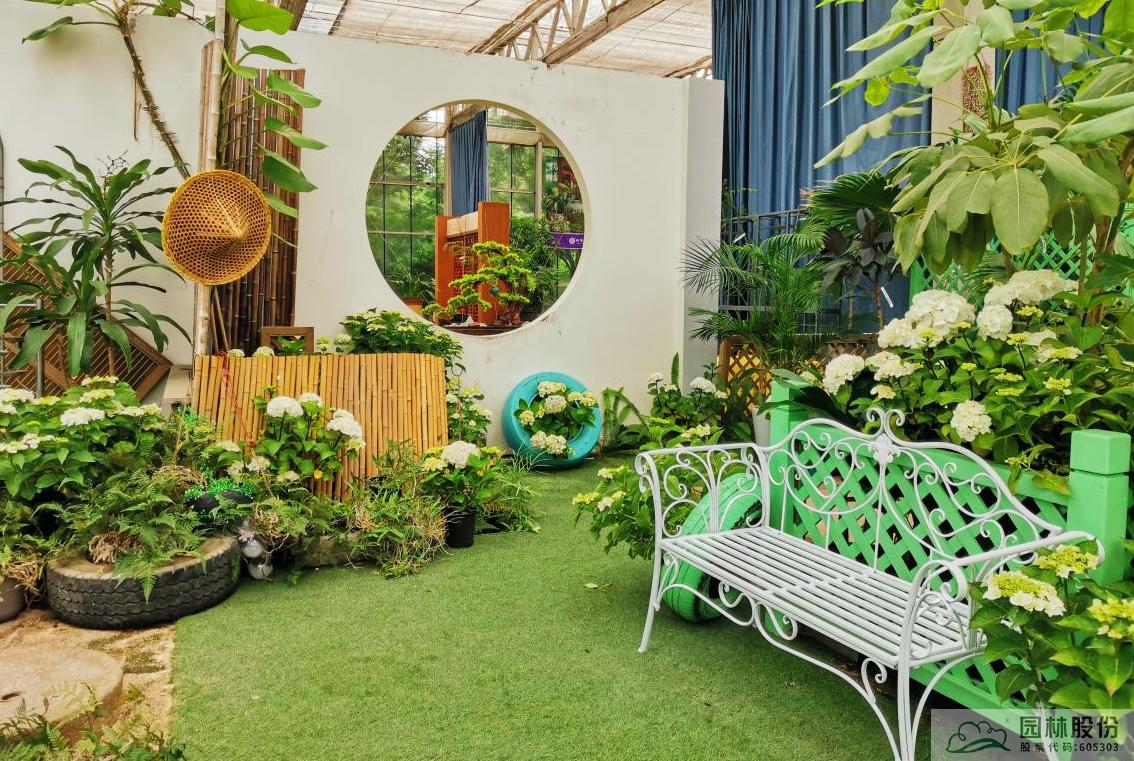 入口轉(zhuǎn)角以粉色、粉紫色繡球?yàn)橹骰▍?,加入搖椅引人注意,用近似色增強(qiáng)整體空間色彩的飽和度;