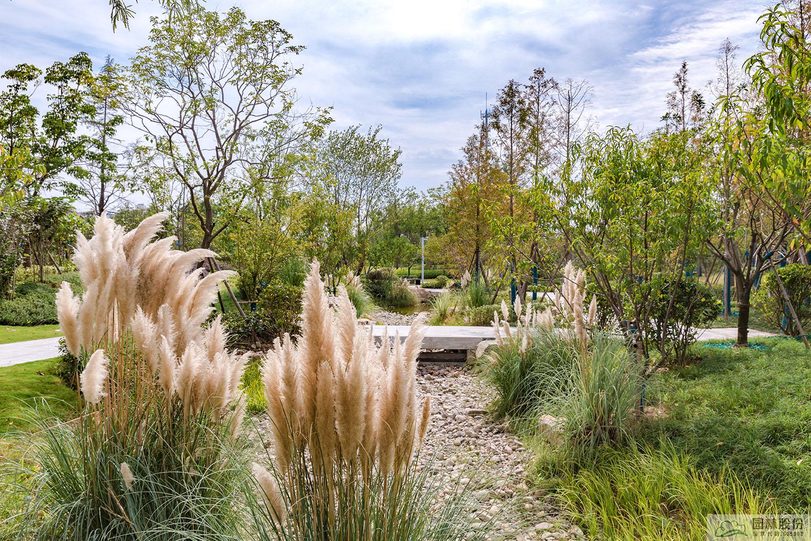 旱溪景觀同樣是海綿城市理念的應(yīng)用典范,下雨時(shí)蓄水,既可用于植物的日常澆灌,又能營(yíng)造出清新靈動(dòng)的水景;干旱時(shí),鋪滿(mǎn)鵝卵石的水底又可與周邊豐富的植物營(yíng)造出另一種園林意境。